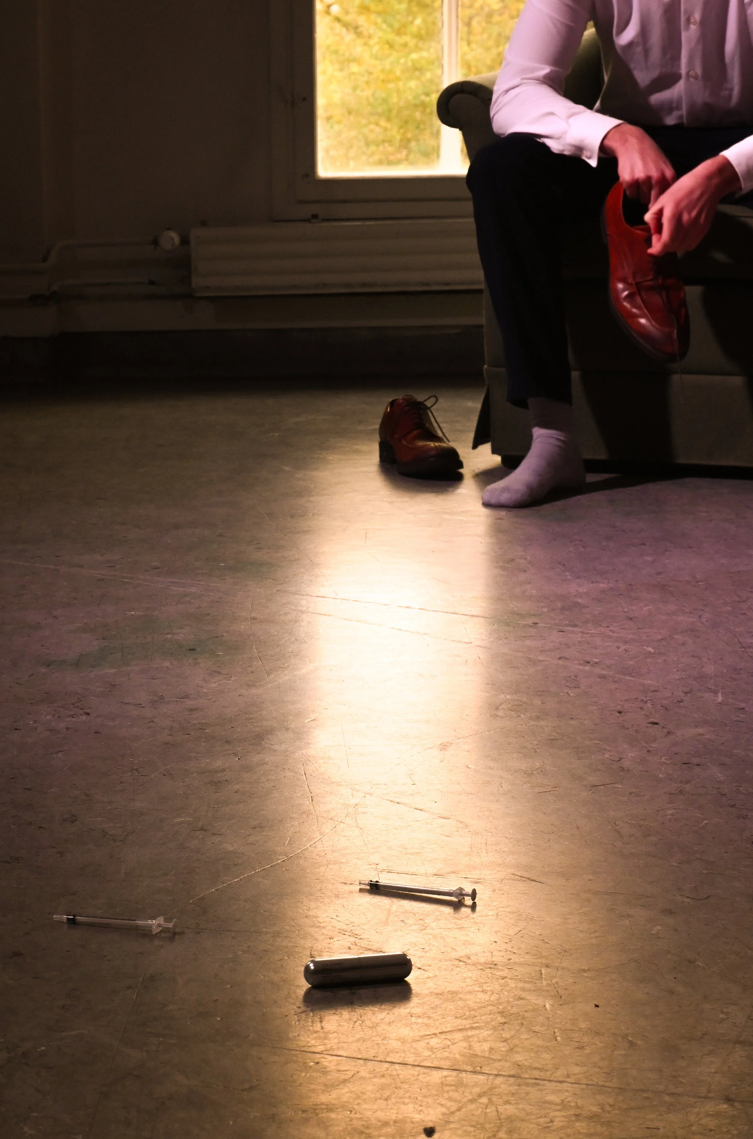 Jeg arbeidet aktivt med lys og lyd som dramaturgiske virkemidler, blant annet gjennom miljølyder, musikk og målrettet bruk av lyd- og lyseffekter. Prøveperioden var strukturert med utgangspunkt i arbeidsmetoden beskrevet i Katie Mitchells The Director’s Craft, med fokus på analyse og prøvestruktur.